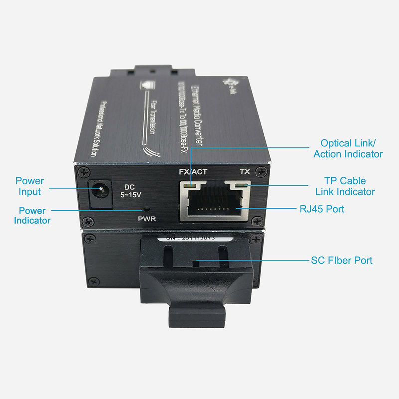 Derzeit unterstützt es zwei Arten von Mediennetzwerkverbindungen: 10Base-T/100Base-TX/1000Base-T und 100/1000Base-SX/LX,elektrische Signale von 10Base-T/100Base-TX/1000Base-T verdrehten Paaren mit optischen Signalen von 100/1000Base-SX/LX miteinander umwandelnEs erweitert die Übertragungsdistanz des Netzes von 100 m über Kupferkabel auf 20 km (bis zu 120 km) über Glasfaserkabel.